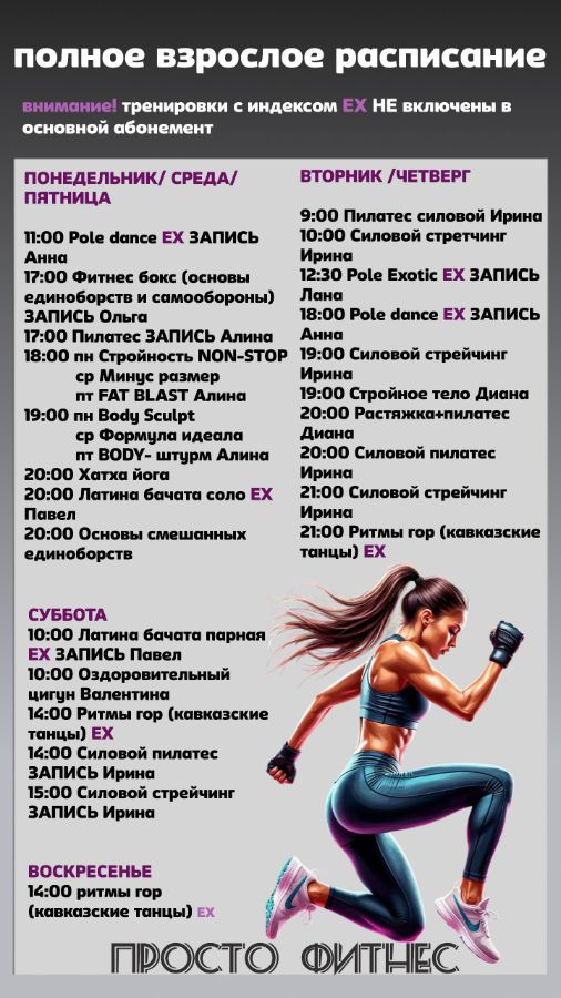 У нас вы сможете заняться фитнесом и танцами, в том числе латиноамериканскими, восточными, Pole Dance, стриппластикой, можно посетить силовые и кардио тренировки, позаниматься йогой, пилатесом и растяжкой.